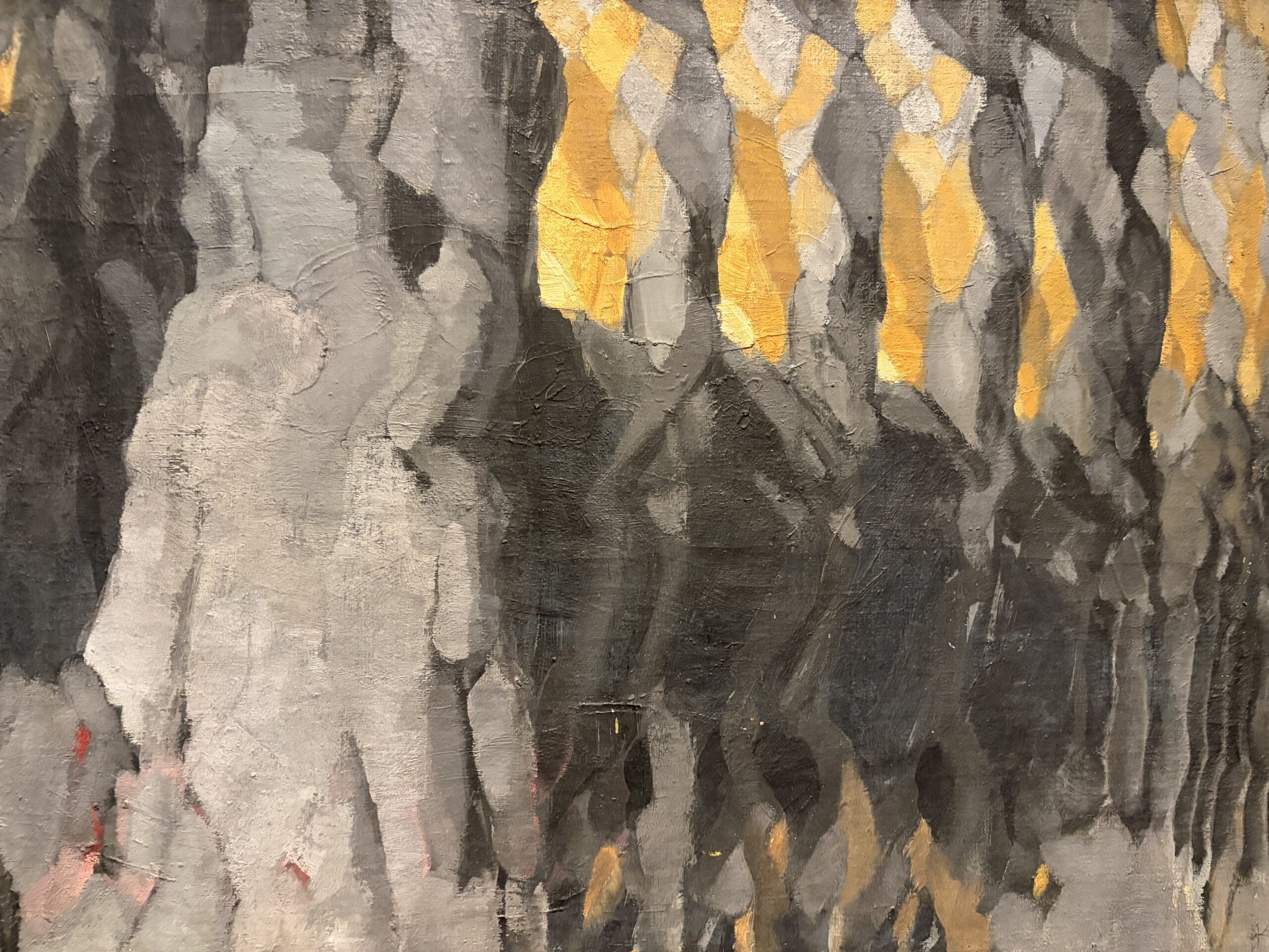 神田神保町でしょうか。高齢多死社会により、膨大な量の古書が吐き出される一方、SNSに即反応する若者は本に時間を費やしません。かつては垂涎の的だった思想や歴史全集も文学者の個人全集も、場所塞ぎとして嫌われ、刊行時からは見る影もない値がついています。これは店舗入り口の書架からさらに外へ追いやられた二束三文の古本ワゴンです。「春疾風」に曝され、背文字の金の箔押しがひかります。豪華な装幀、誠実な幾人もの校正と編集、心血の注がれた香り高い文章の本が見捨てられています。狂躁しかない文化衰退期の無惨さ。フェイクの時代を「古書の箔」が告発します。
